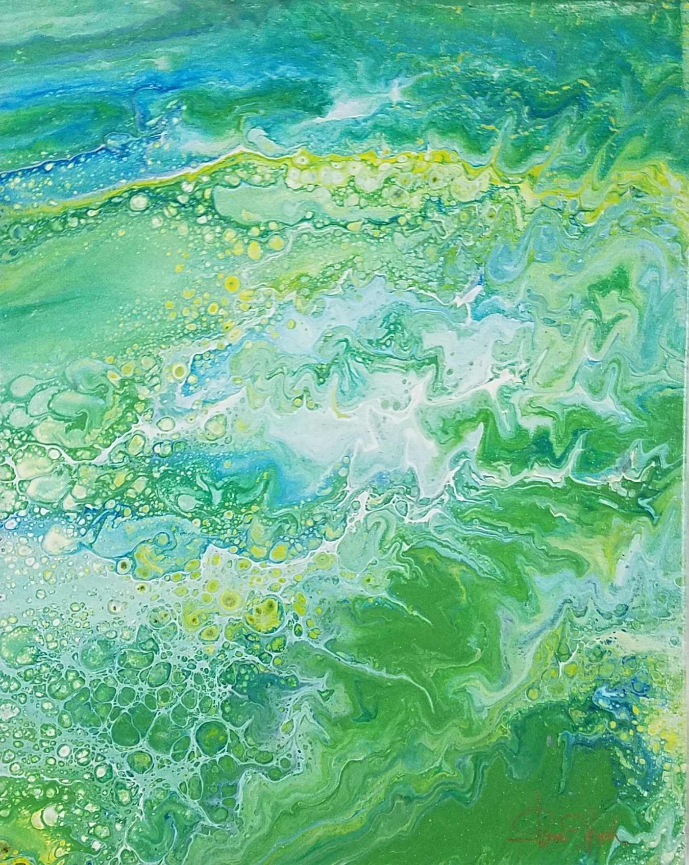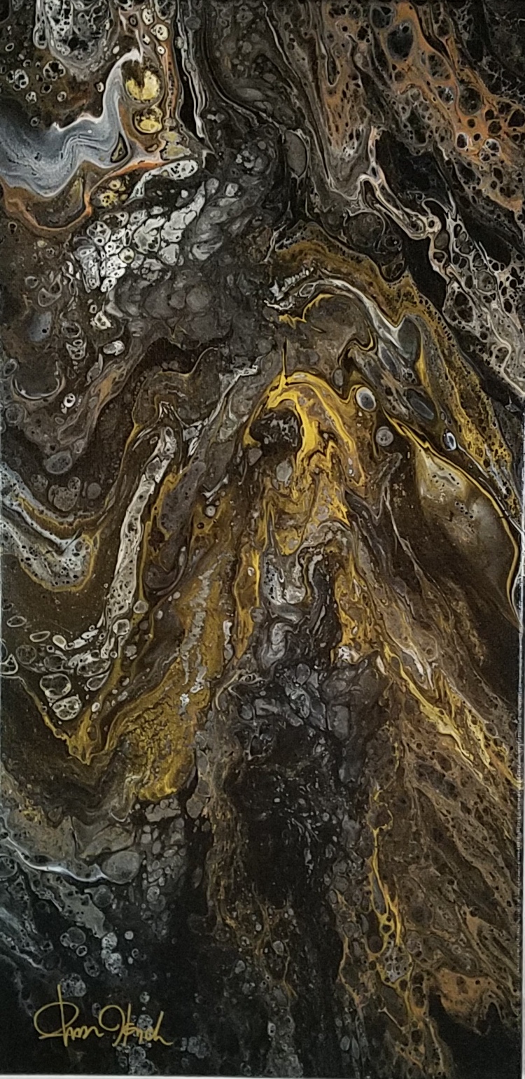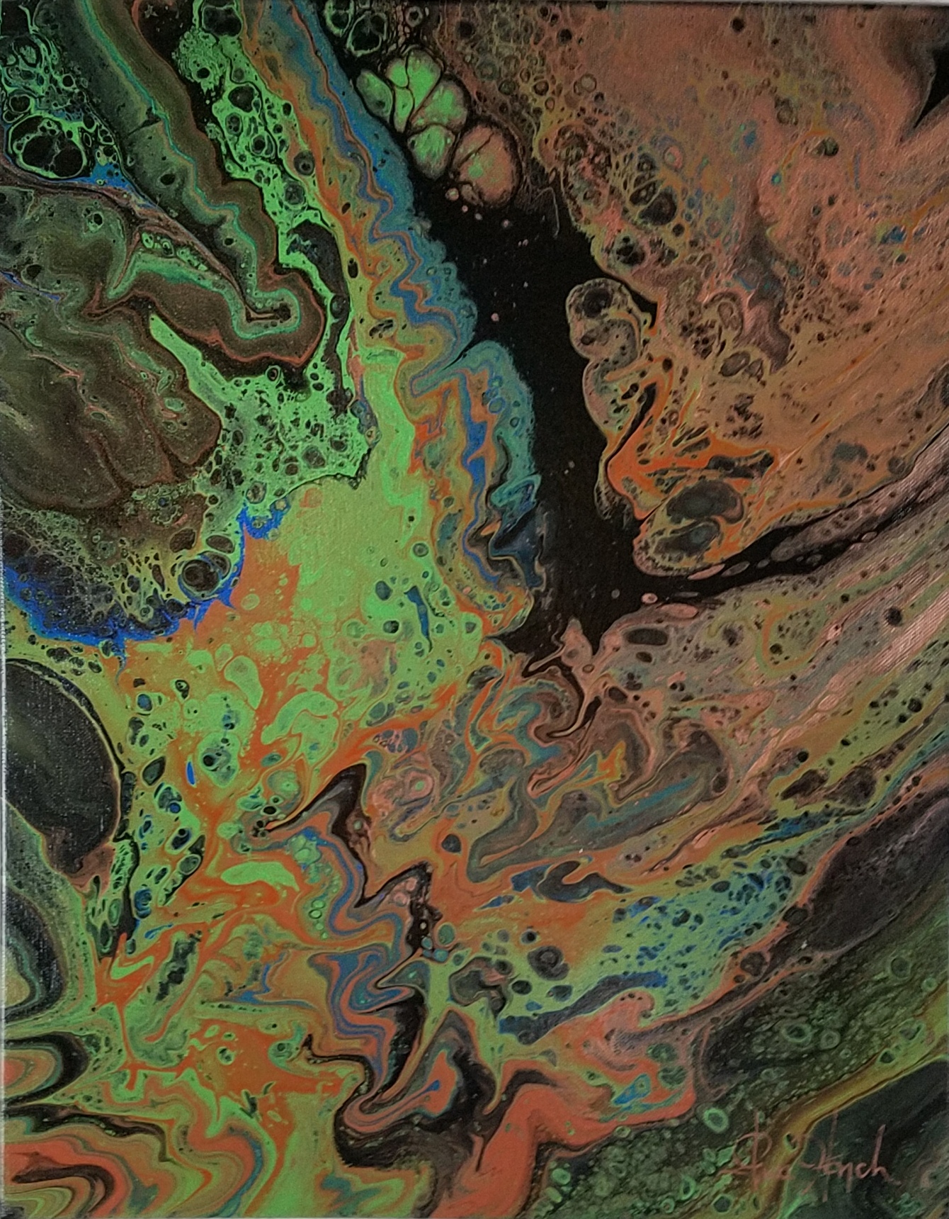 This is the newest art form that I am exploring. Of all of the art I create, this form is the most unpredictable. I find this unpredictable aspect to be freeing, yet a bit stressful. All of my other art is very controlled and thought out and this is a nice change for me. Acrylic paint is altered with other various’ liquid concoctions’ and applied to the canvas in various ways. The liquid paint can then be manipulated and moved on the surface. The different colors mix together to create other colors and also re-act to the added ingredients…an unpredictable outcome.