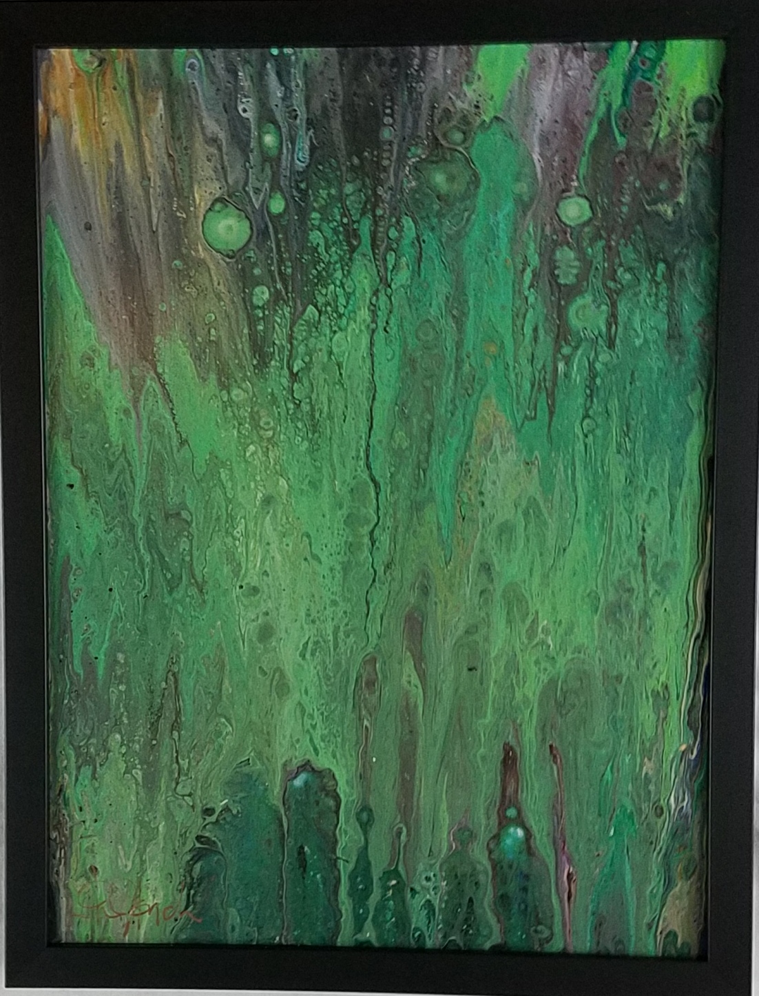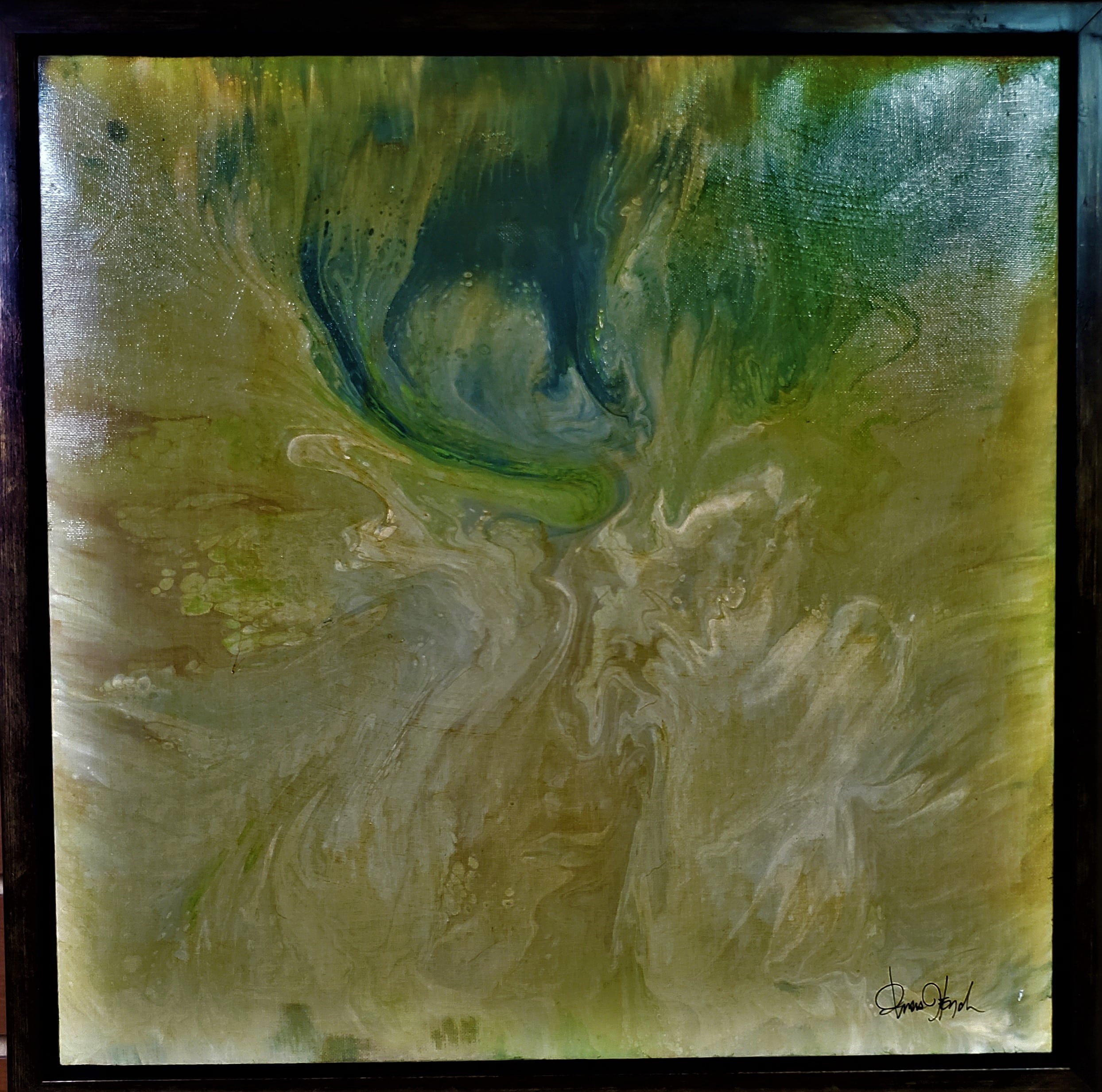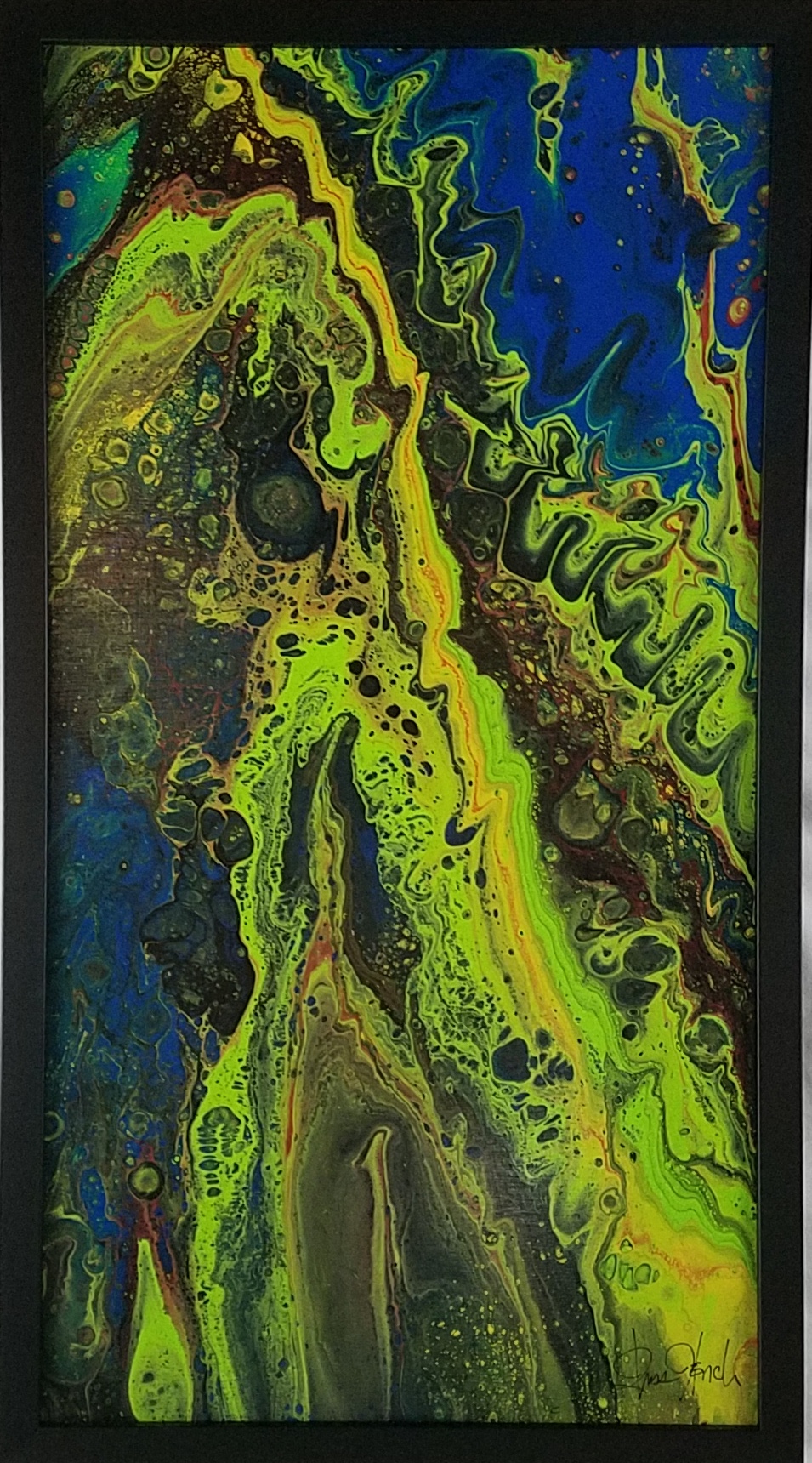 This is the newest art form that I am exploring. Of all of the art I create, this form is the most unpredictable. I find this unpredictable aspect to be freeing, yet a bit stressful. All of my other art is very controlled and thought out and this is a nice change for me. Acrylic paint is altered with other various’ liquid concoctions’ and applied to the canvas in various ways. The liquid paint can then be manipulated and moved on the surface. The different colors mix together to create other colors and also re-act to the added ingredients…an unpredictable outcome.
